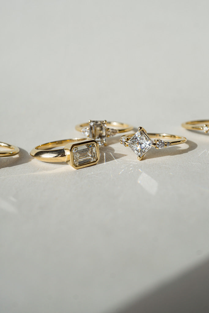 Start by choosing your diamond or sapphire, then select a setting you love. From there, we craft your ring in your chosen gold color and size — made just for you.