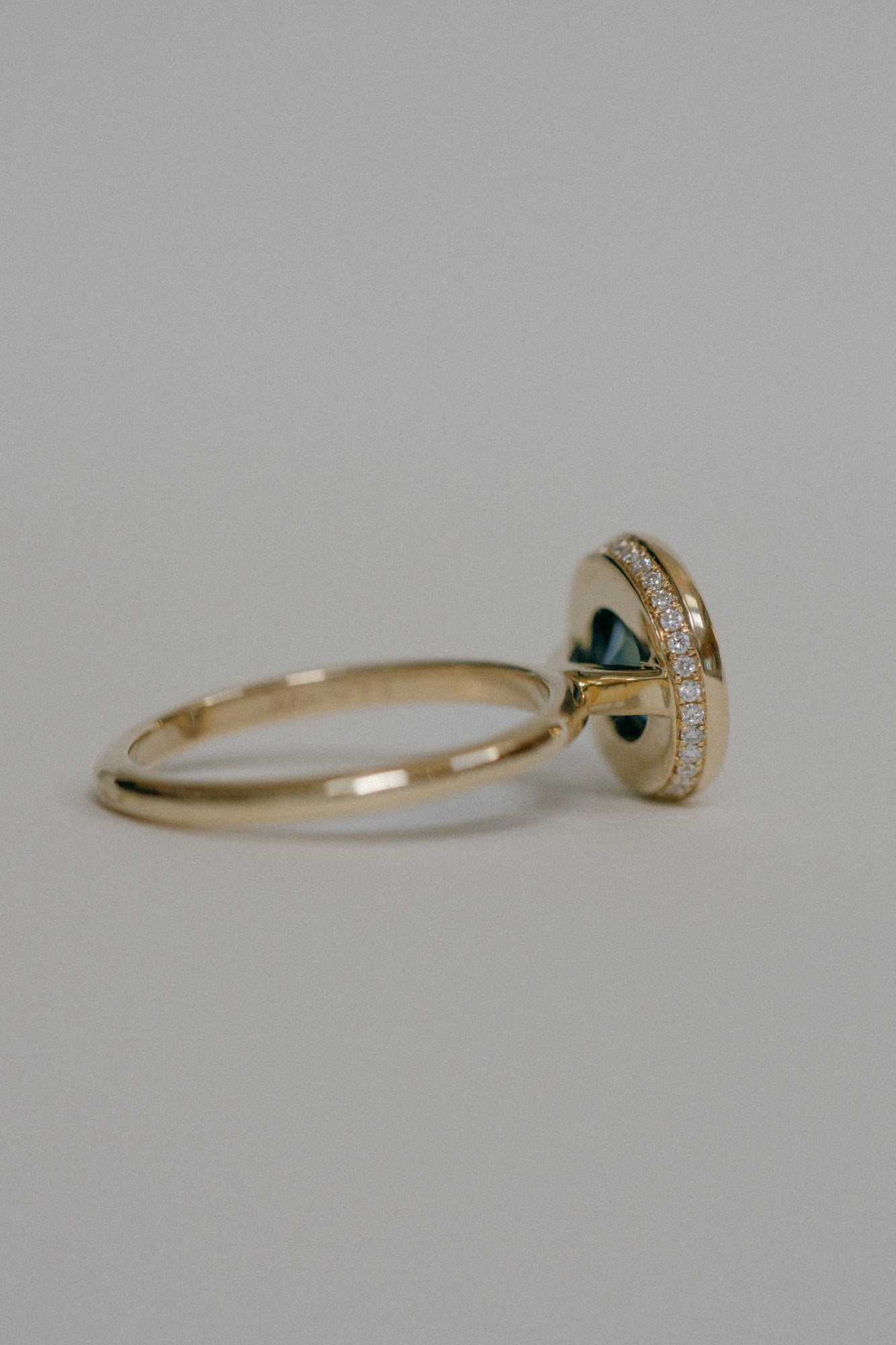 A marvelous wonder. This Pele Ring is set with a one-of-a-kind, conflict-free natural round brilliant cut teal Australian sapphire, with a surprise hidden halo below. Currently a size 7, but resizable--email us your size after you purchase it online. Only one and ready to ship!