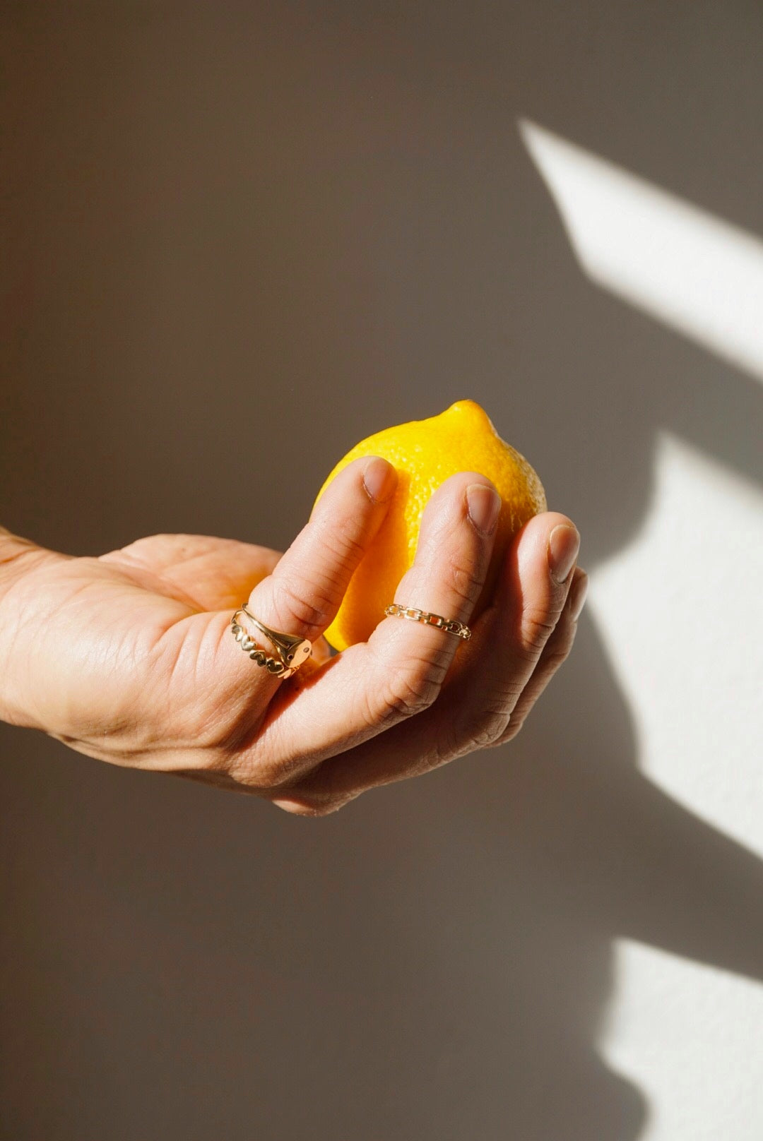 You can also use a polishing cloth for extra shine and to remove any tarnish. Sometimes 14K gold can tarnish a bit—particularly earrings or the inside of rings—depending on your skin chemistry, but it is a very easy fix.