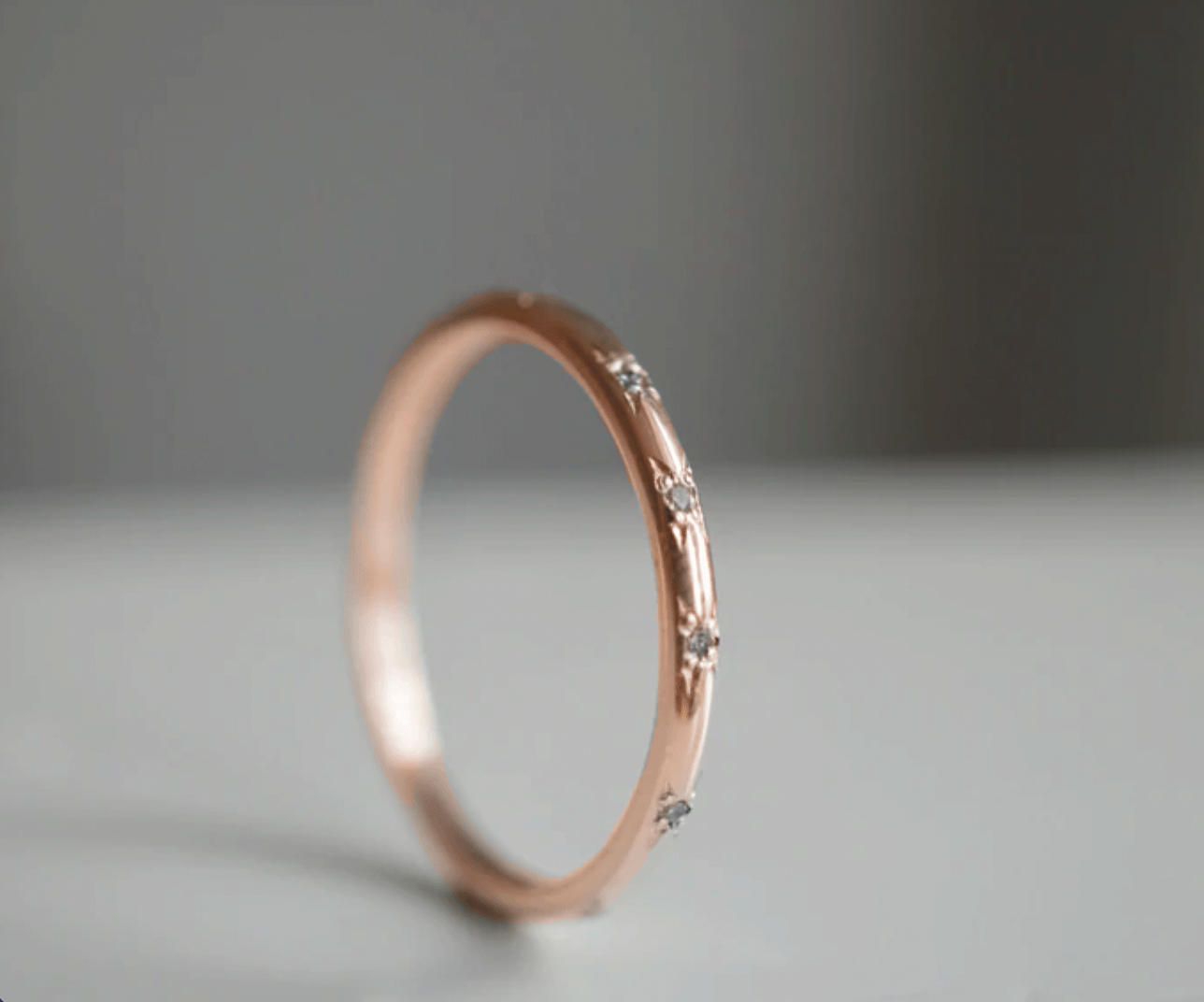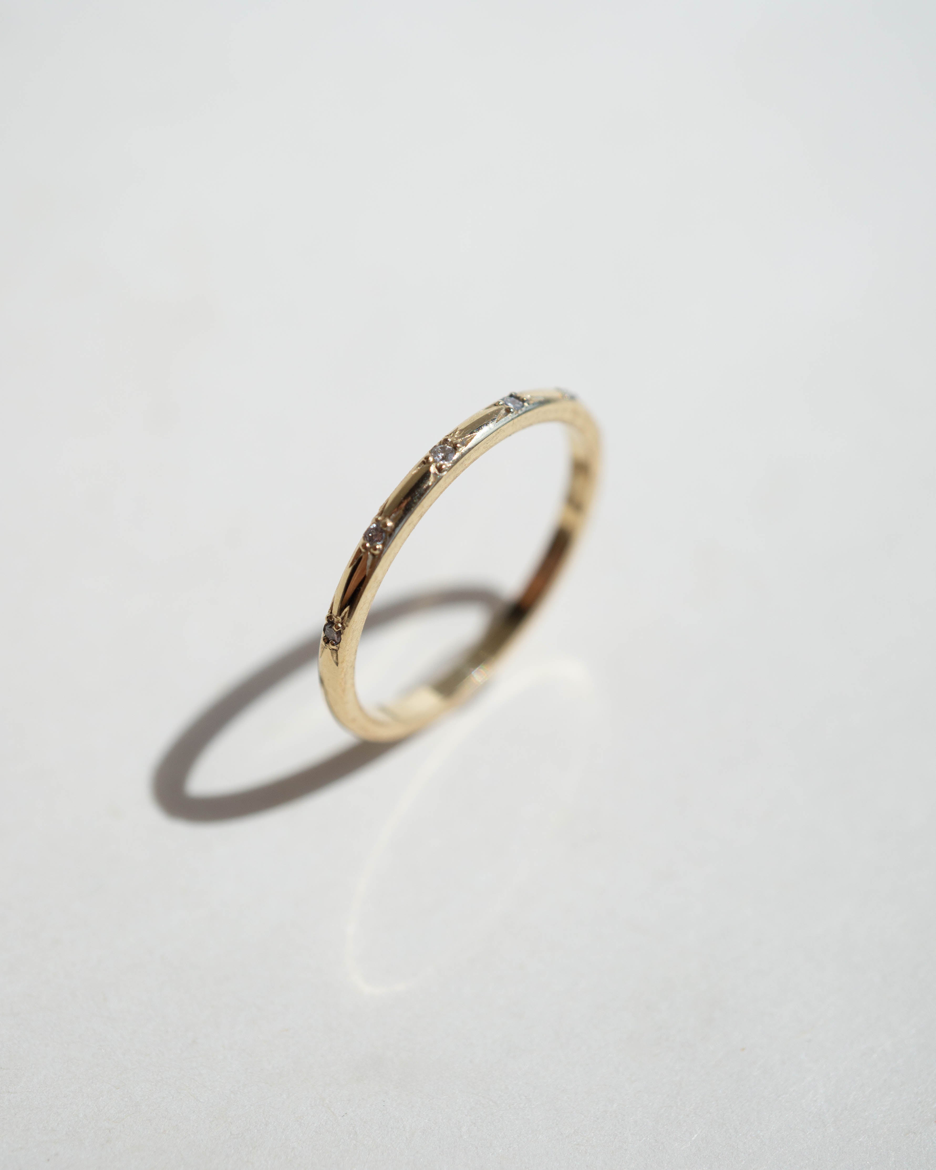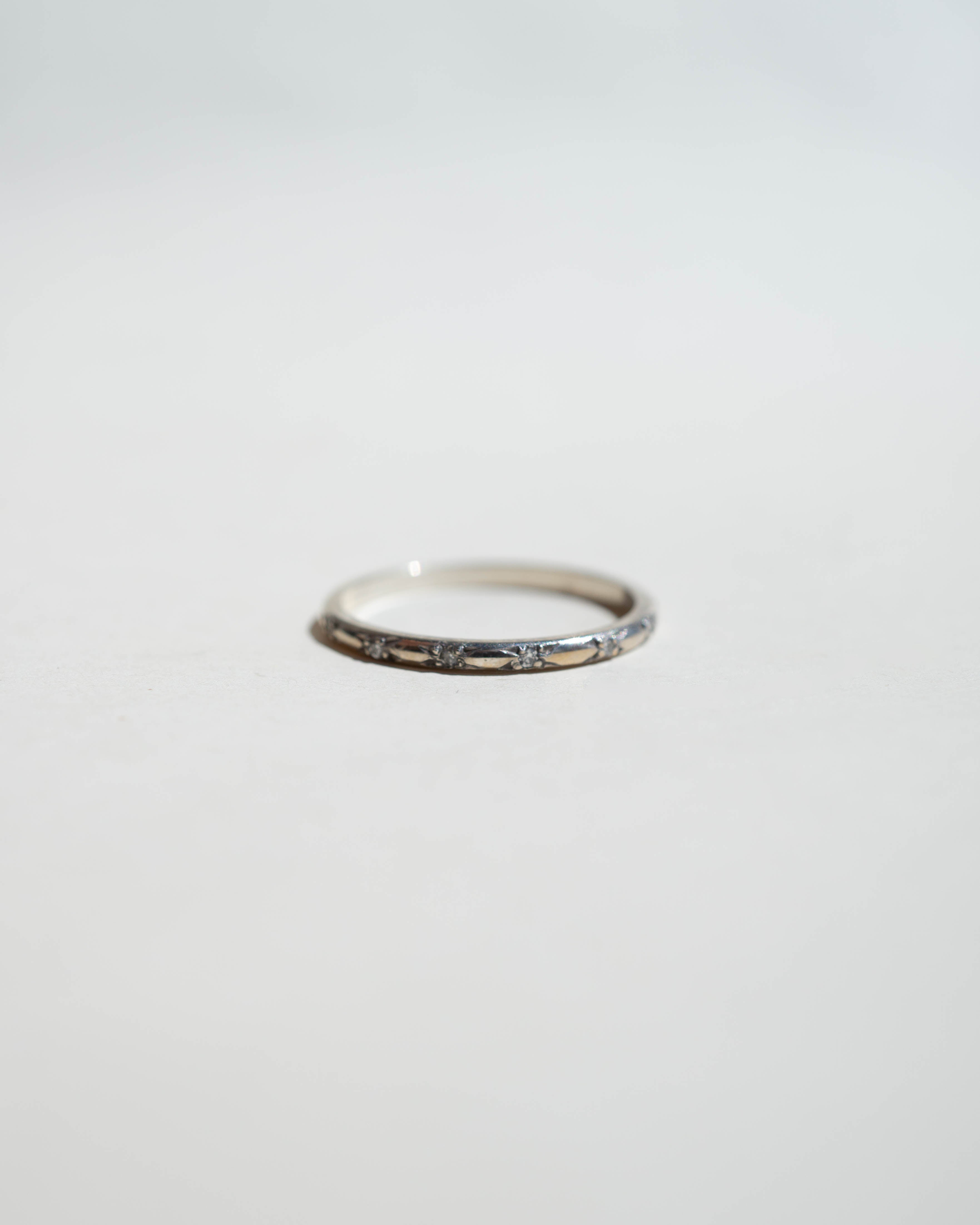 • ~.07tcw; Highlighting 7x salt and pepper or white conflict-free diamonds evenly spaced out on the top part of the band.