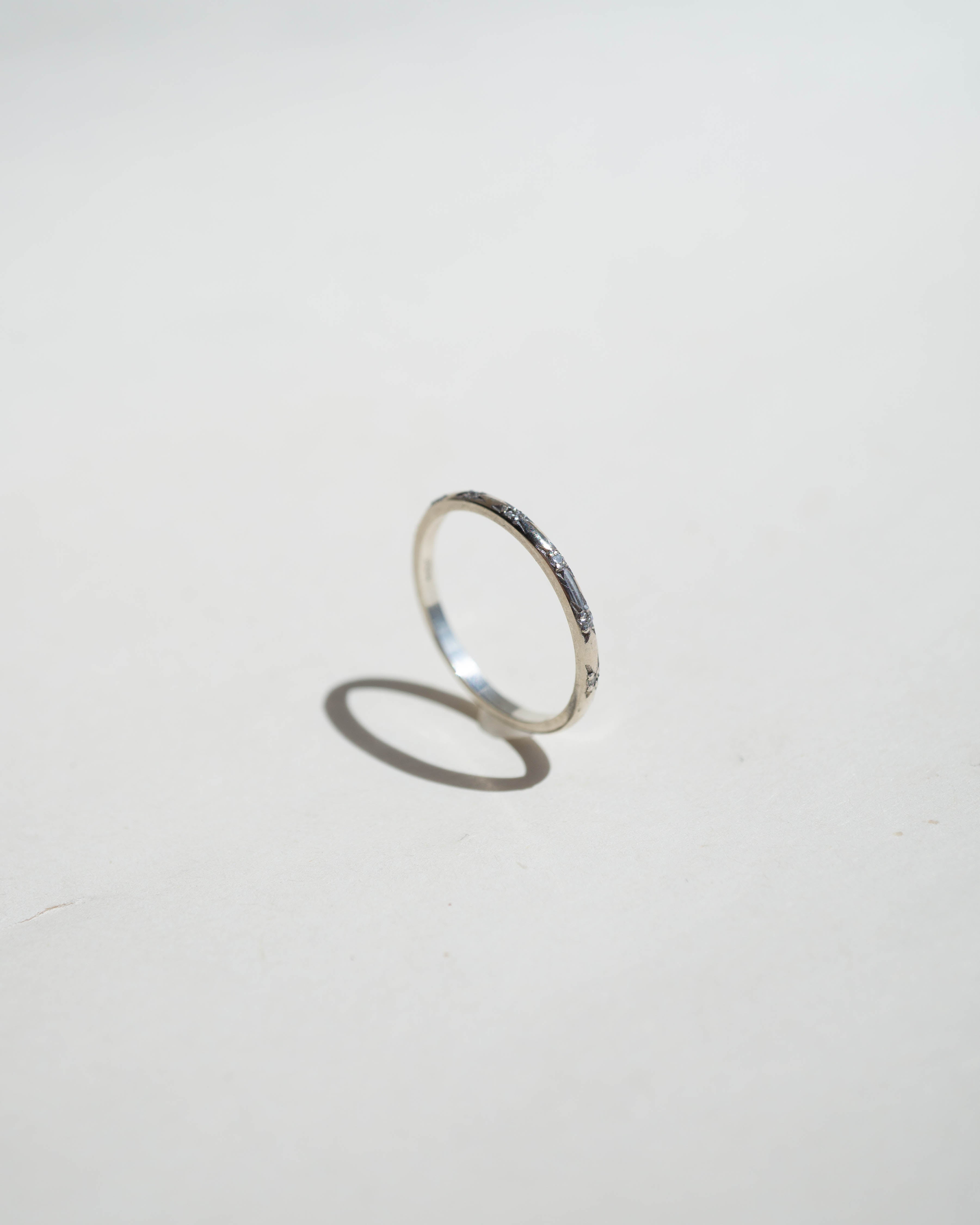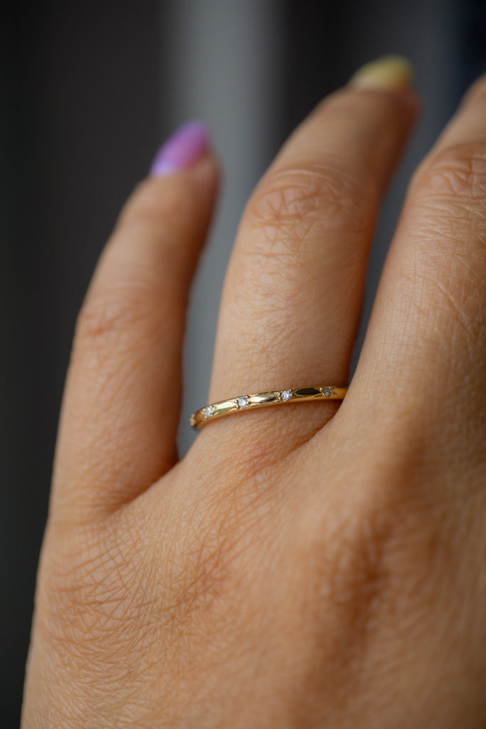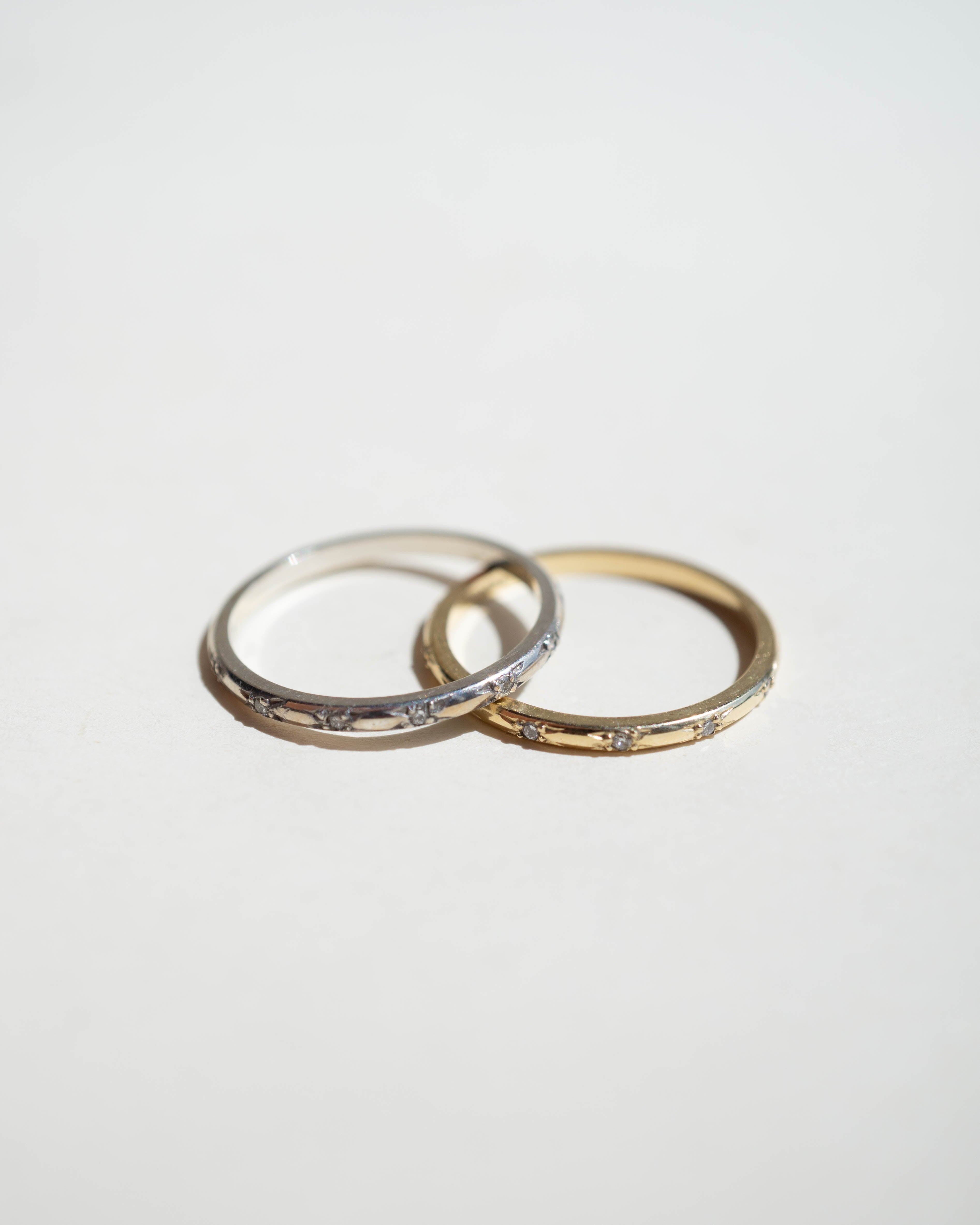 • ~.07tcw; Highlighting 7x salt and pepper or white conflict-free diamonds evenly spaced out on the top part of the band.