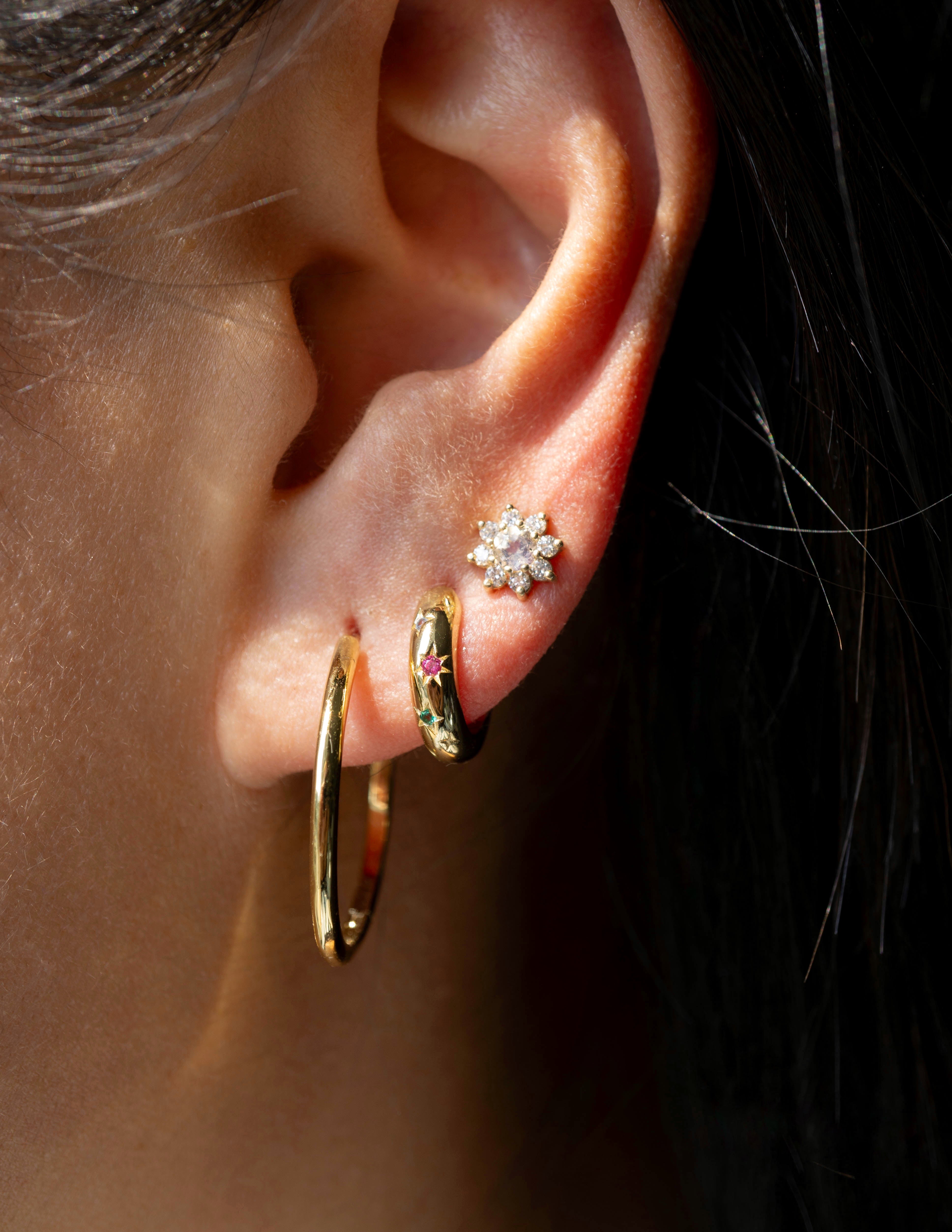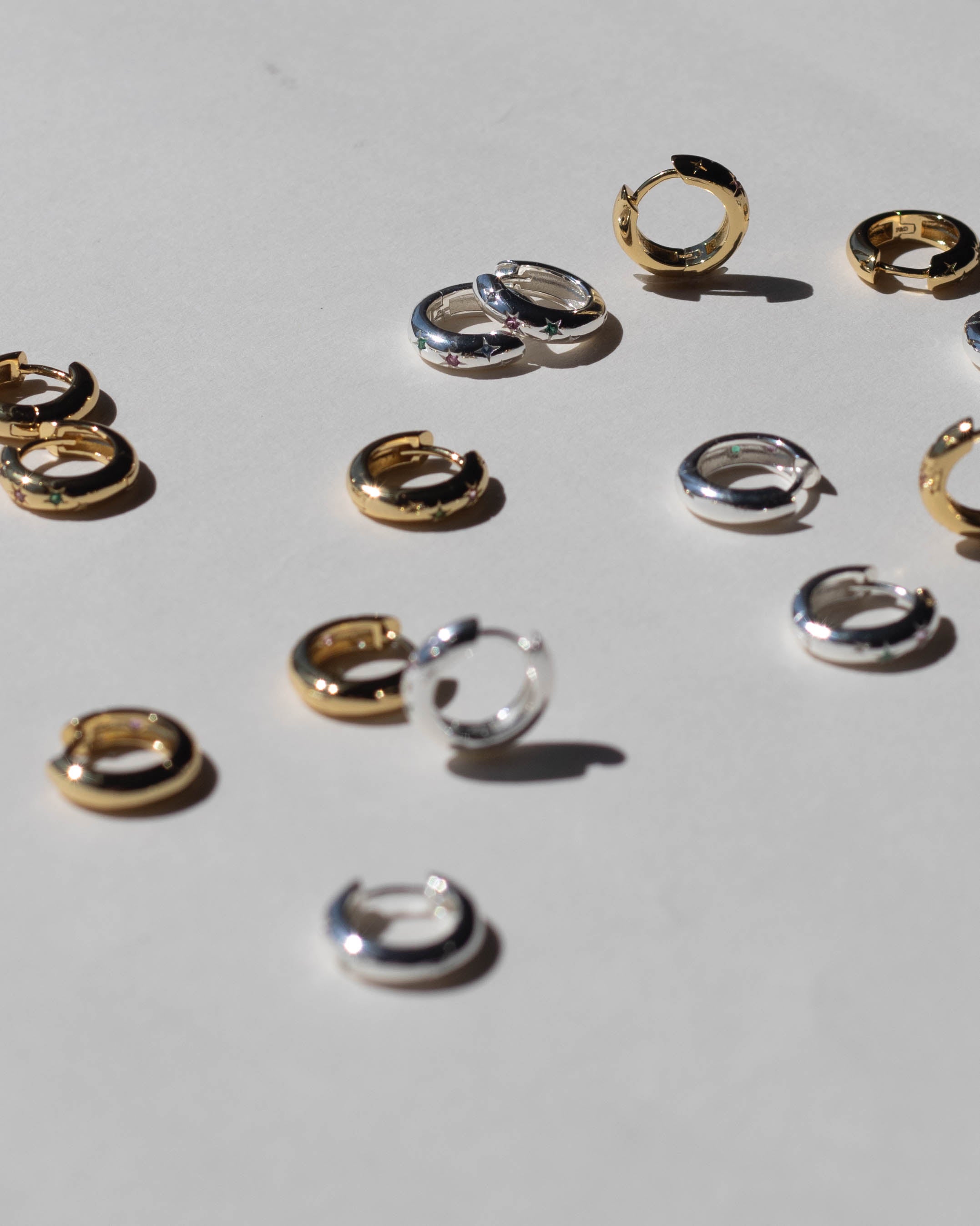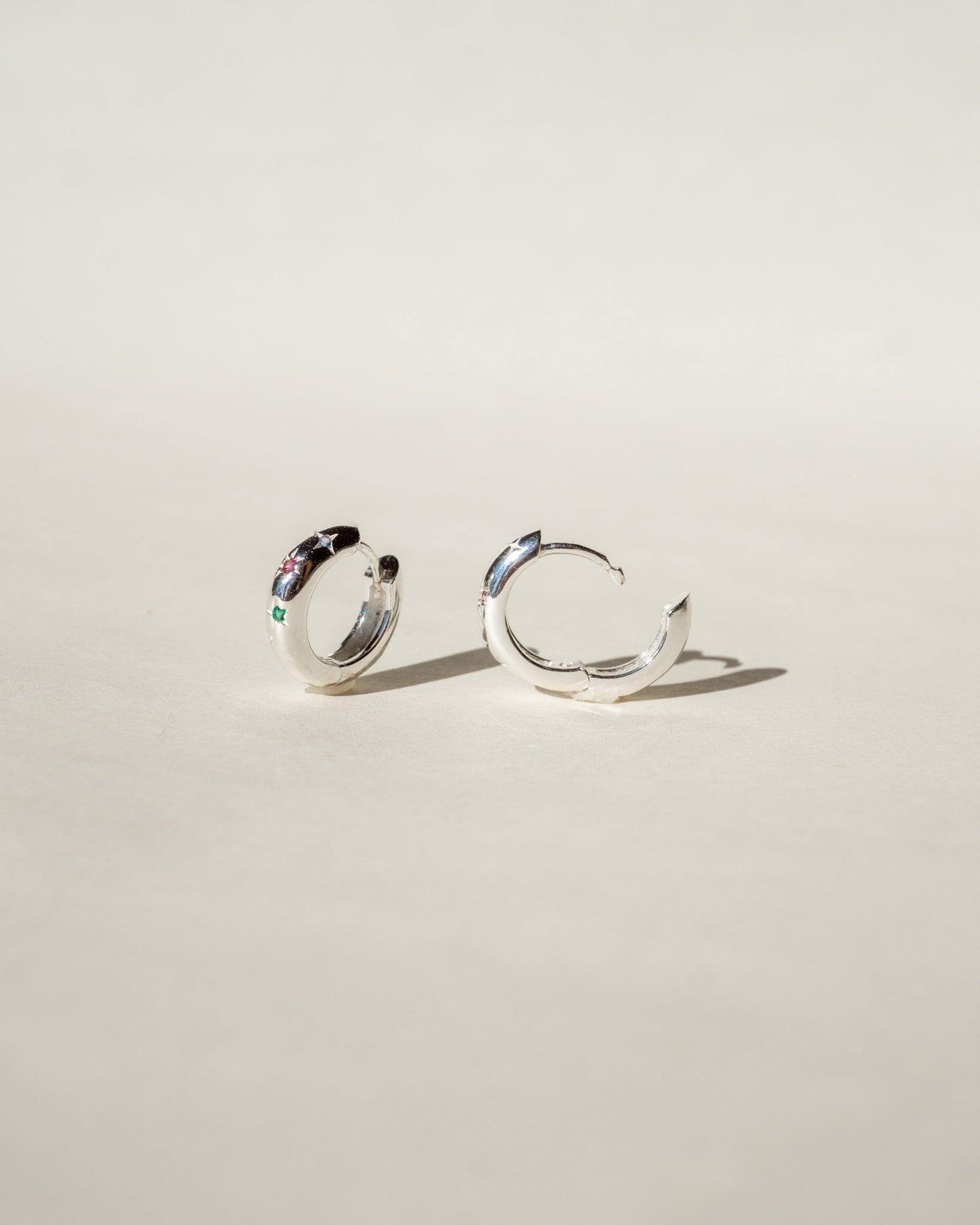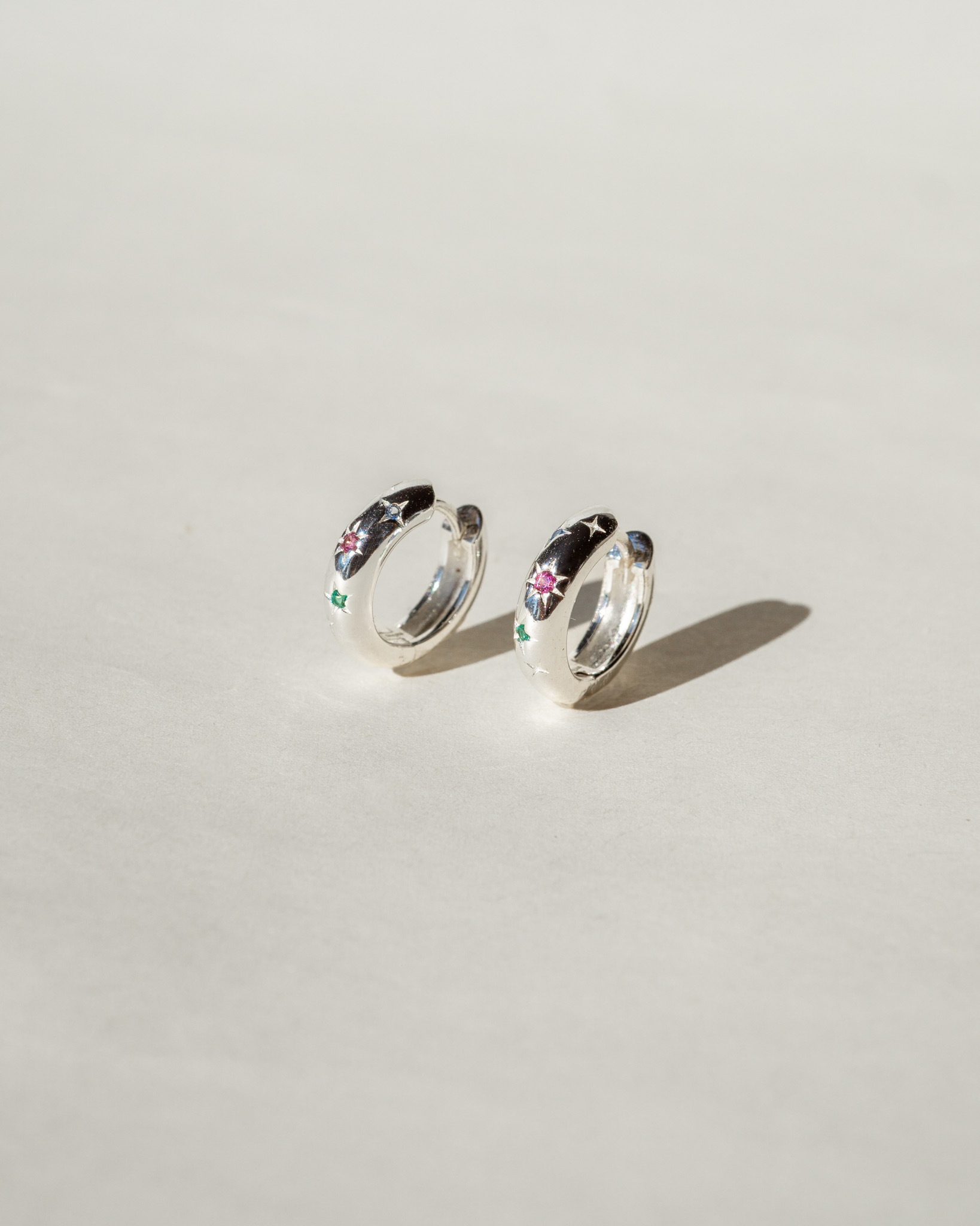 Add a touch of starry charm to your look with our In The Stars Huggie Hoops. Each pair highlights star set multicolored sapphires and hand engraved stars.