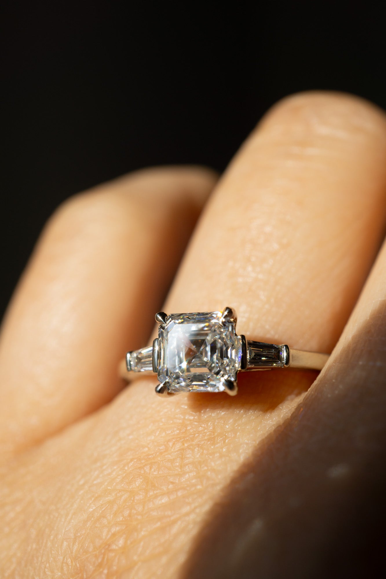 The Keiko Ring is a one-of-a-kind, conflict-free Asscher Cut White Lab Diamond, with perfect tapered baguette white diamond side stones. Currently a size 7, but resizable--email us your size after you purchase it online. Only one and ready to ship!