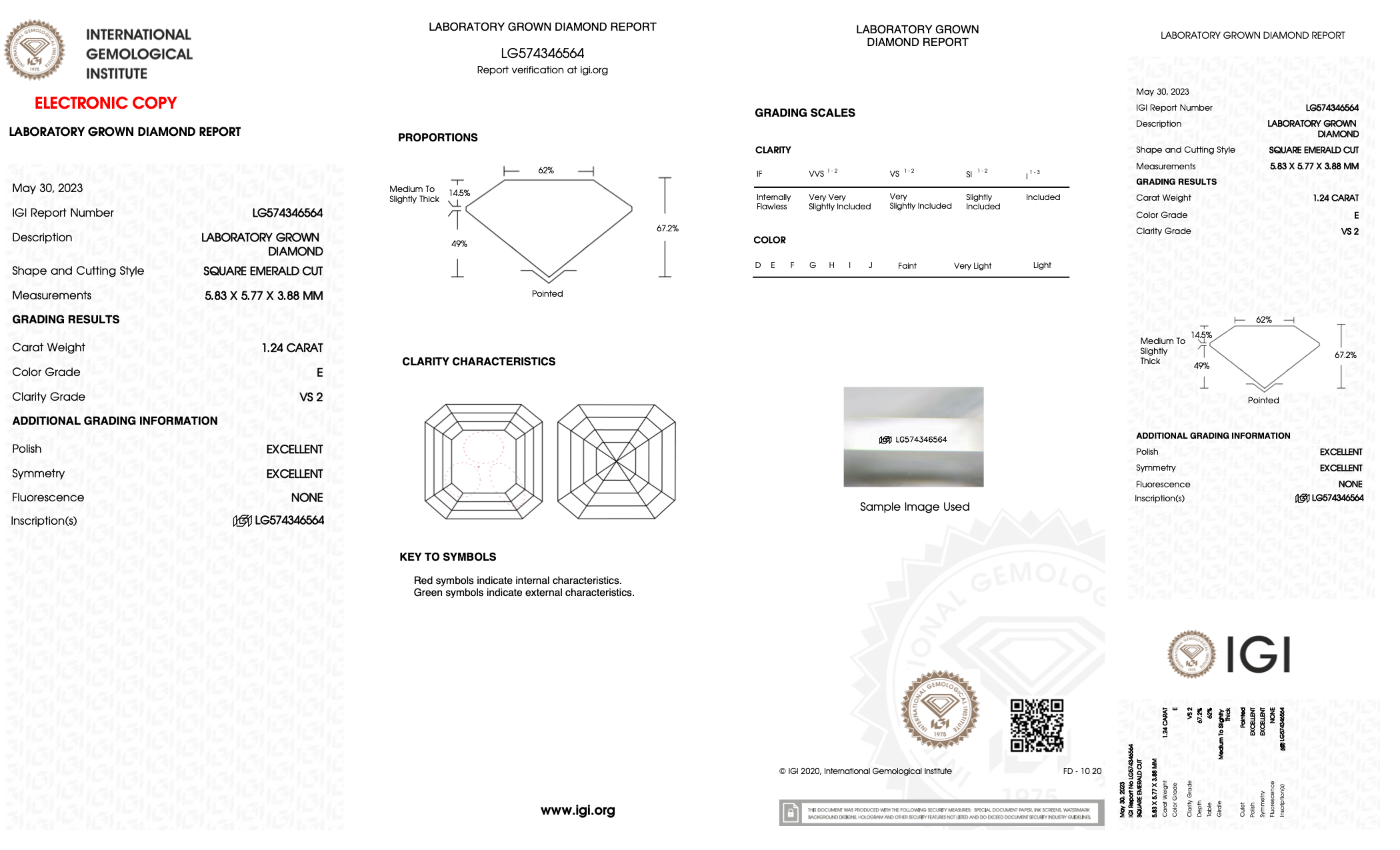 • 1.24ct / 5.83x5.77x3.88mm Asscher cut White Lab Diamond (VS2/E), ethically sourced and handpicked to ensure beauty and quality