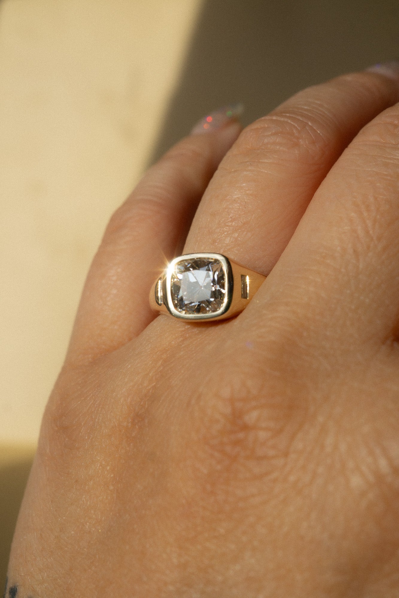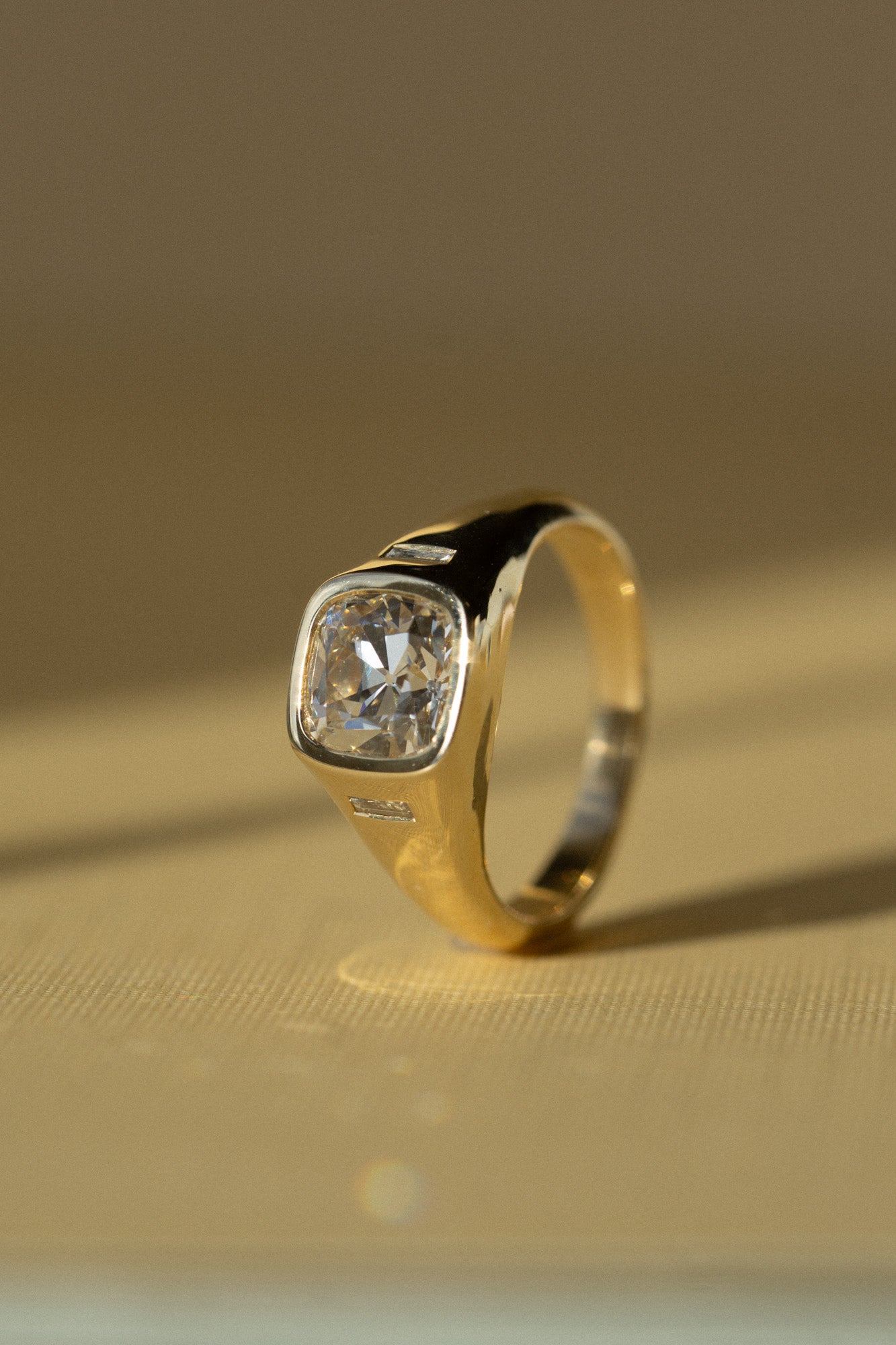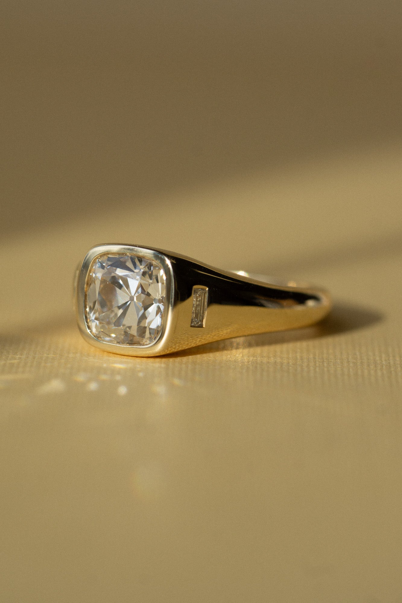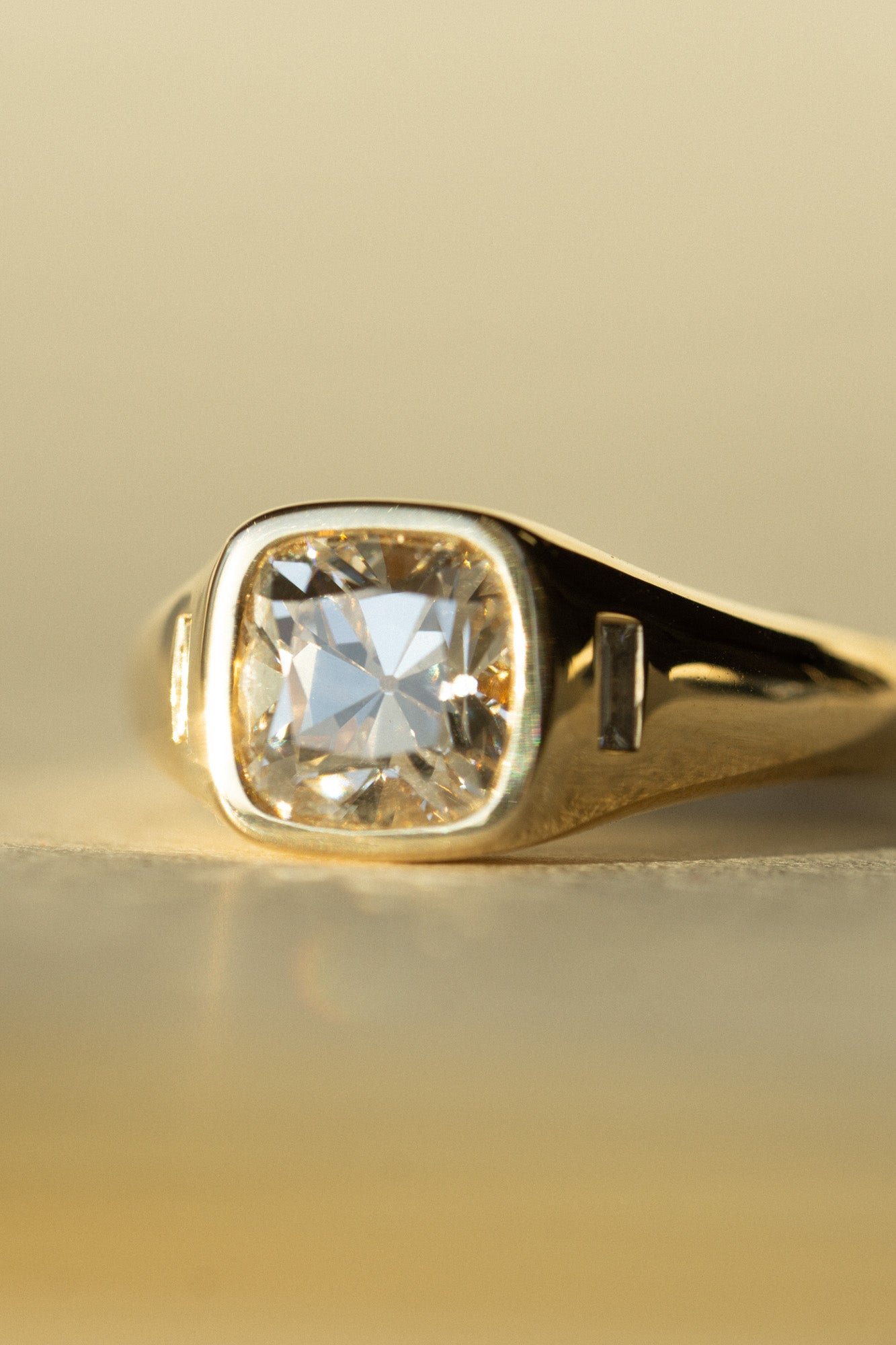 A ring for the ages, combining a familiar heirloom resonance to a modern aesthetic. This noteworthy 2.02ct old mine cut lab diamond is paired with baguette side diamonds for a sophisticated art deco-inspired look. Currently a size 7, but resizable--email us your size after you purchase it online. This one-of-a-kind ring was designed by Katherine with this particular stone in mind. Only one and ready to ship!