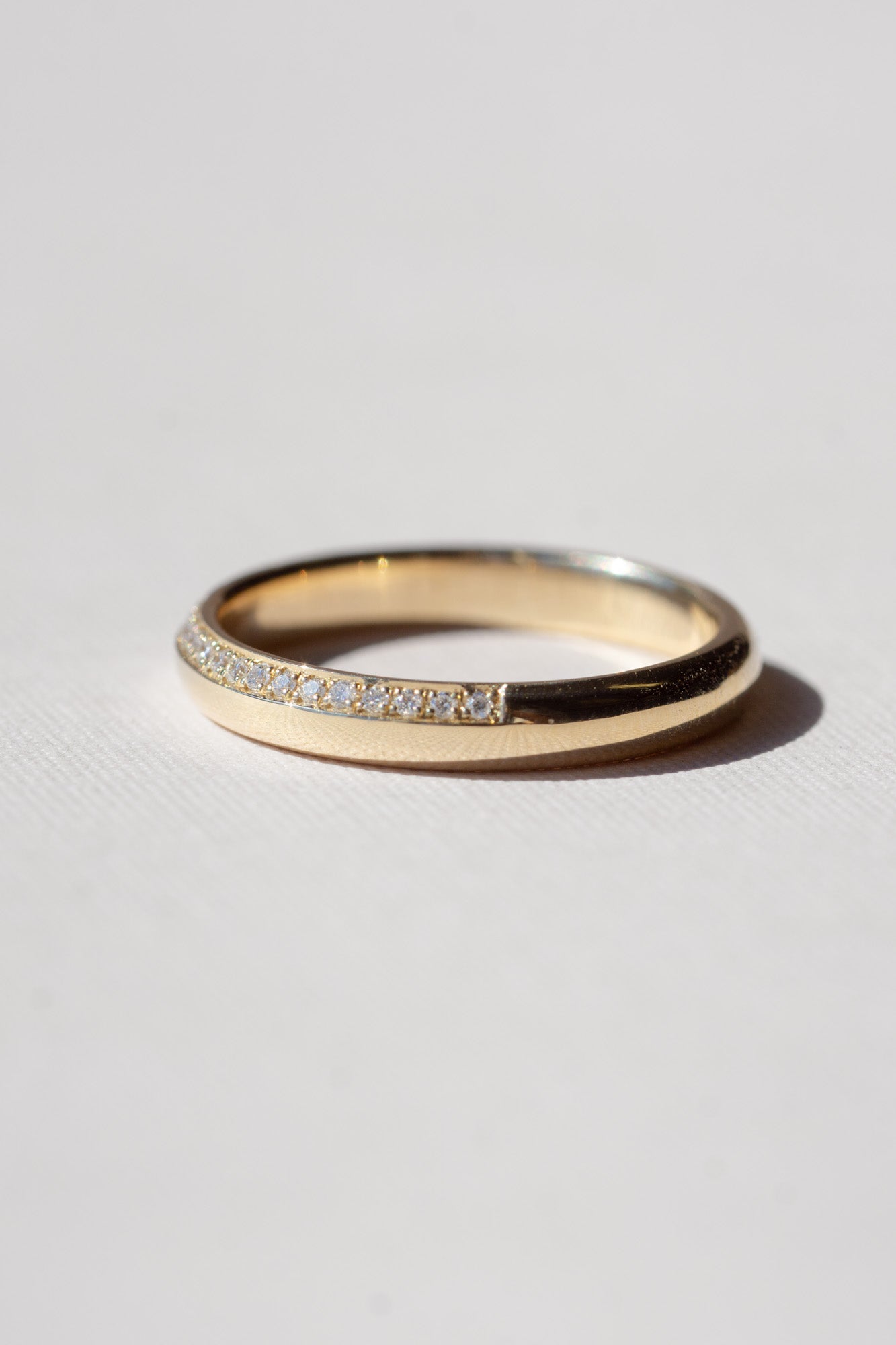 Set with diamonds all along the top, the Io Ring sparkles with fiery brilliance-- just like the moon it is named after, Io. Makes for a dreamy pairing with our Pele engagement ring.
