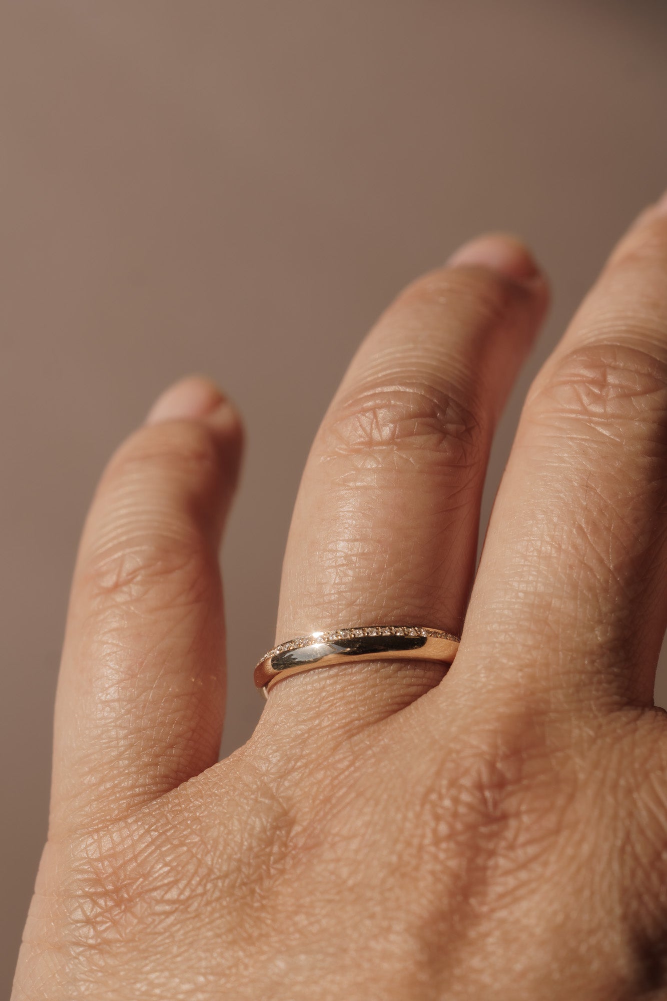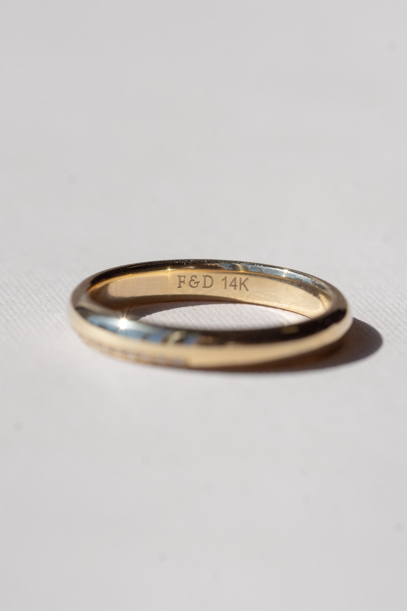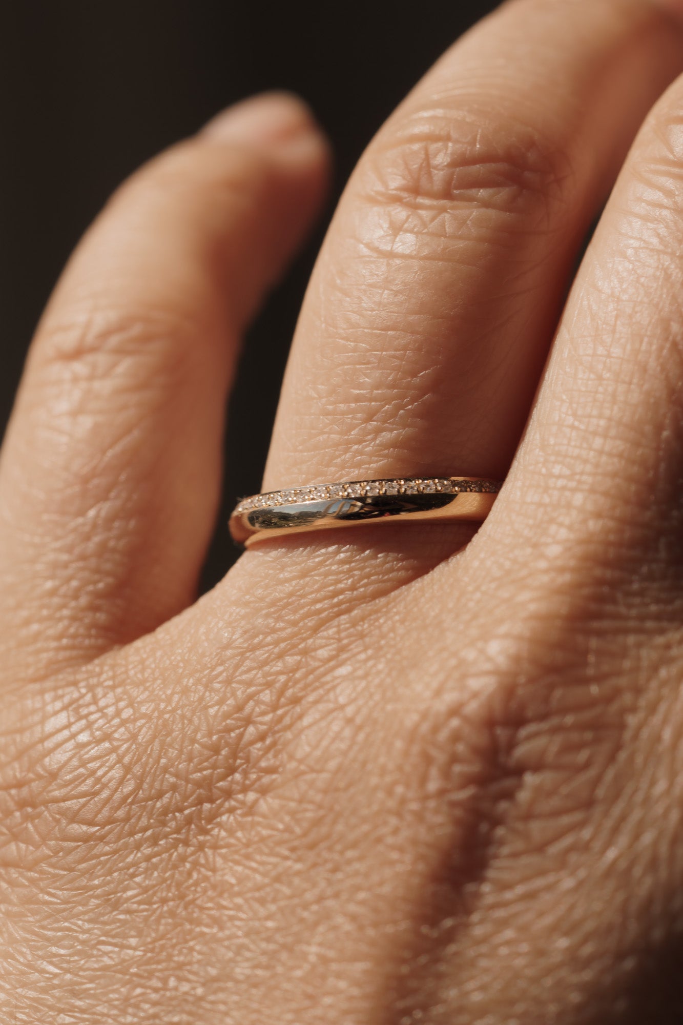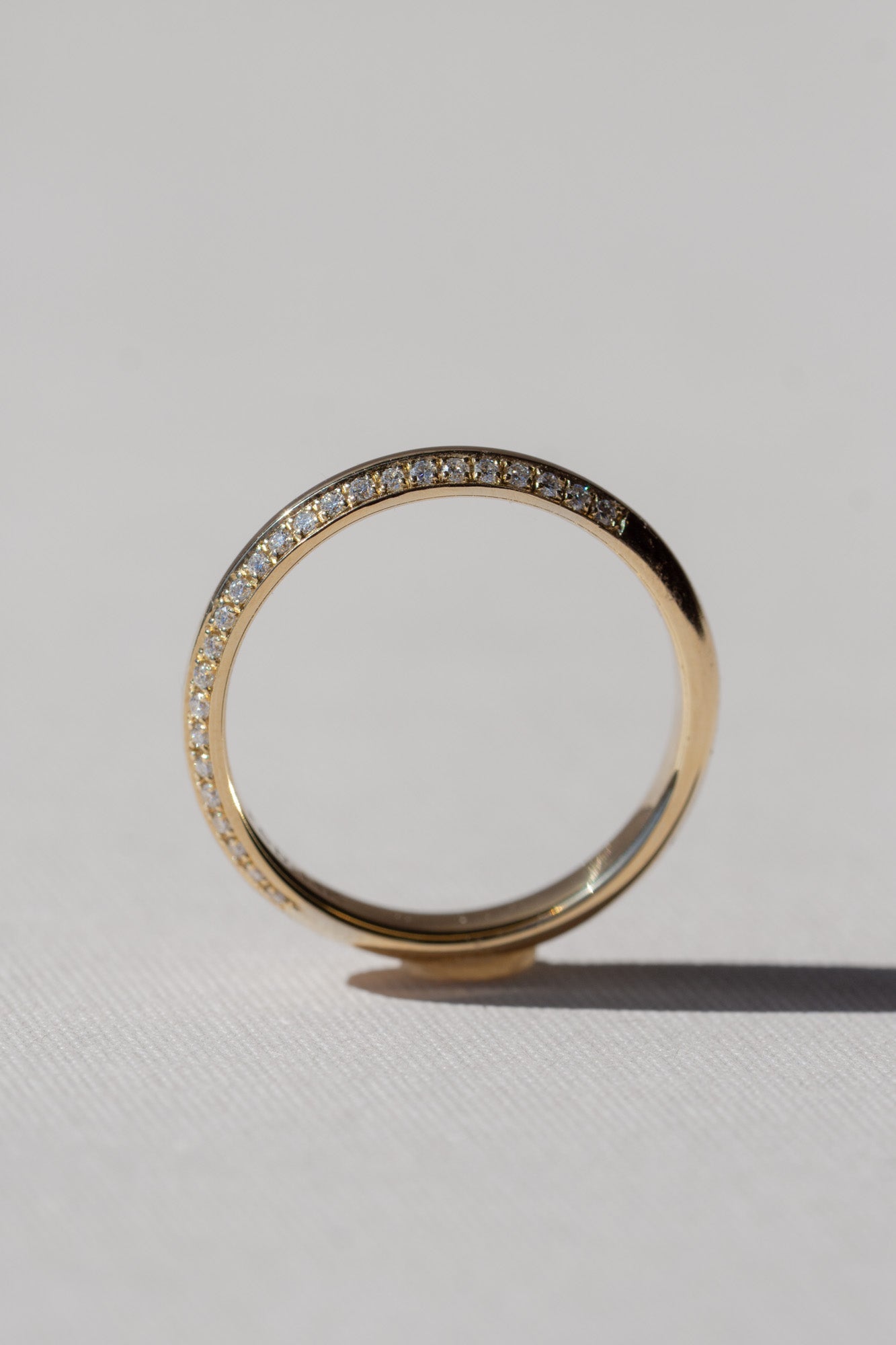 • 0.125tcw; 1mm white round natural diamonds flush-set on top half of band (G+/SI)